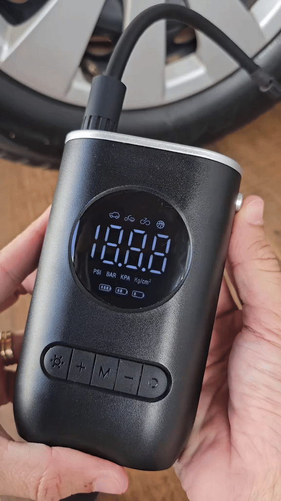 Ugrađeno LED svetlo olakšava upotrebu u mraku, dok više nastavaka omogućava univerzalnu primenu – od automobilskih i biciklističkih guma, do lopti i dušeka.