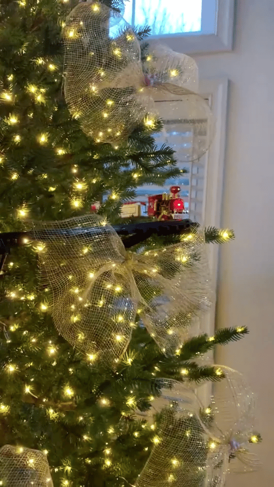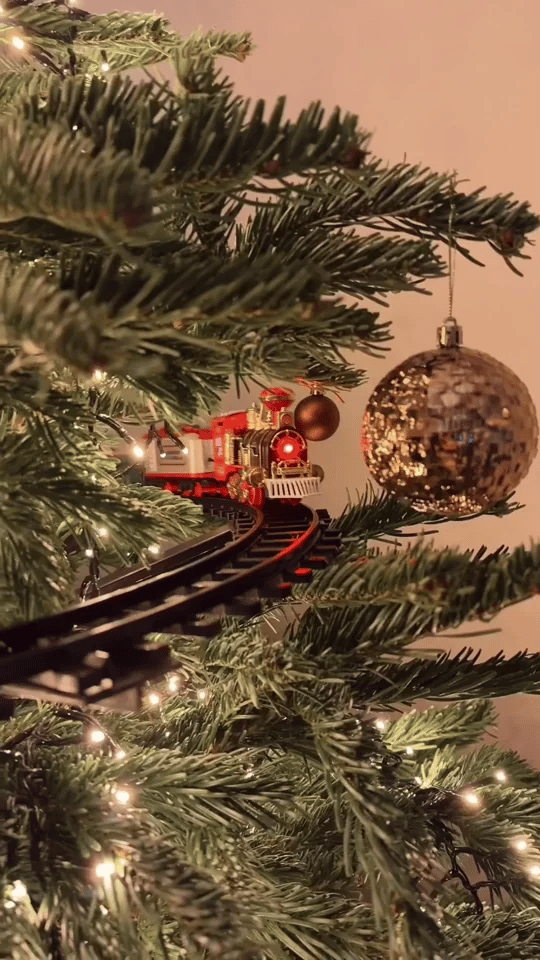 Prvo se vide samo lampice… toplo svetlo, mir u sobi, sve spremno za prazničnu atmosferu. A onda – iznenada, među granama jelke pojavi se mali crveni voz, kao da je upravo stigao sa rute direktno od Severnog pola. 🎅✨