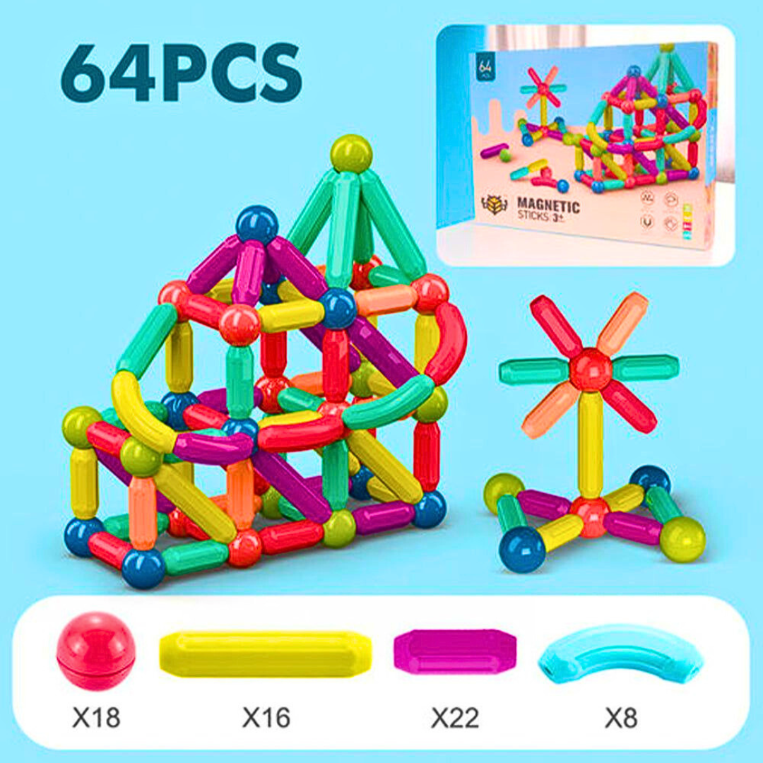 Zaboravi na igračke koje dosade posle par dana. Uz 64 šarena magnetna dela, dete svaki put može da napravi potpuno novu tvorevinu – kulu, zvezdicu, most, raketu ili „nešto svoje“ što ni ti ne možeš da zamisliš.
