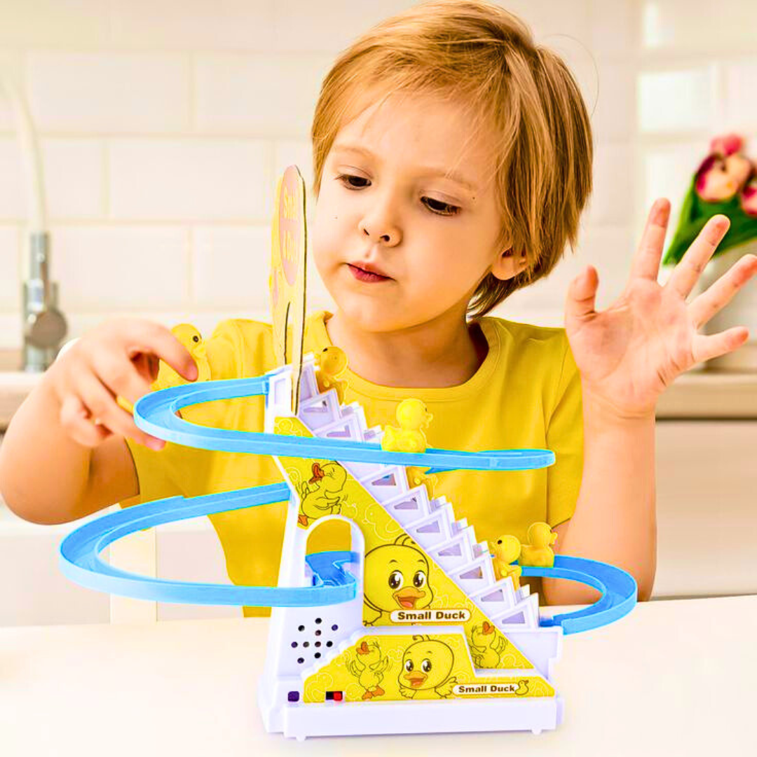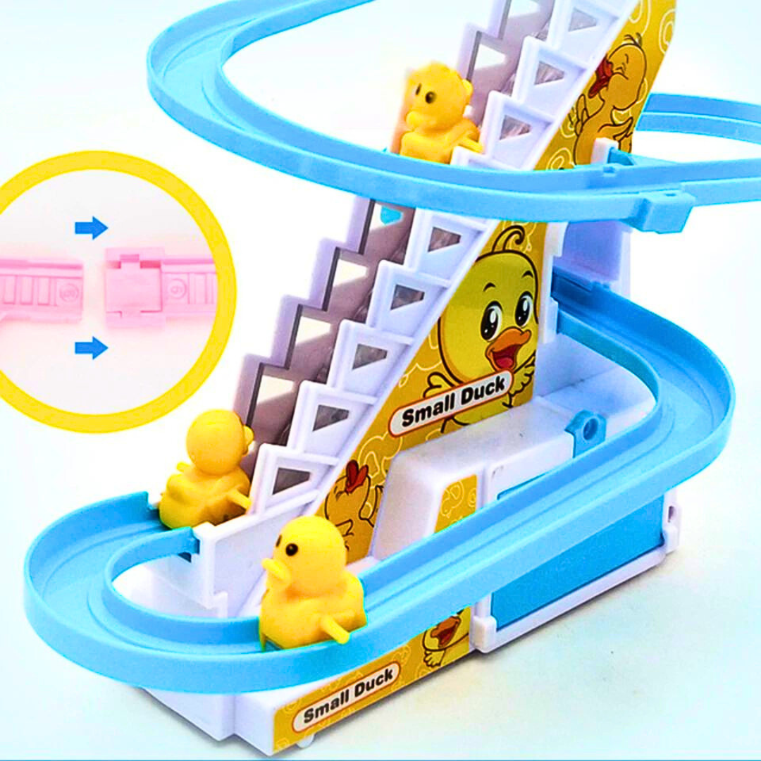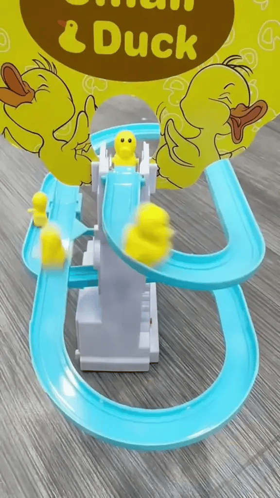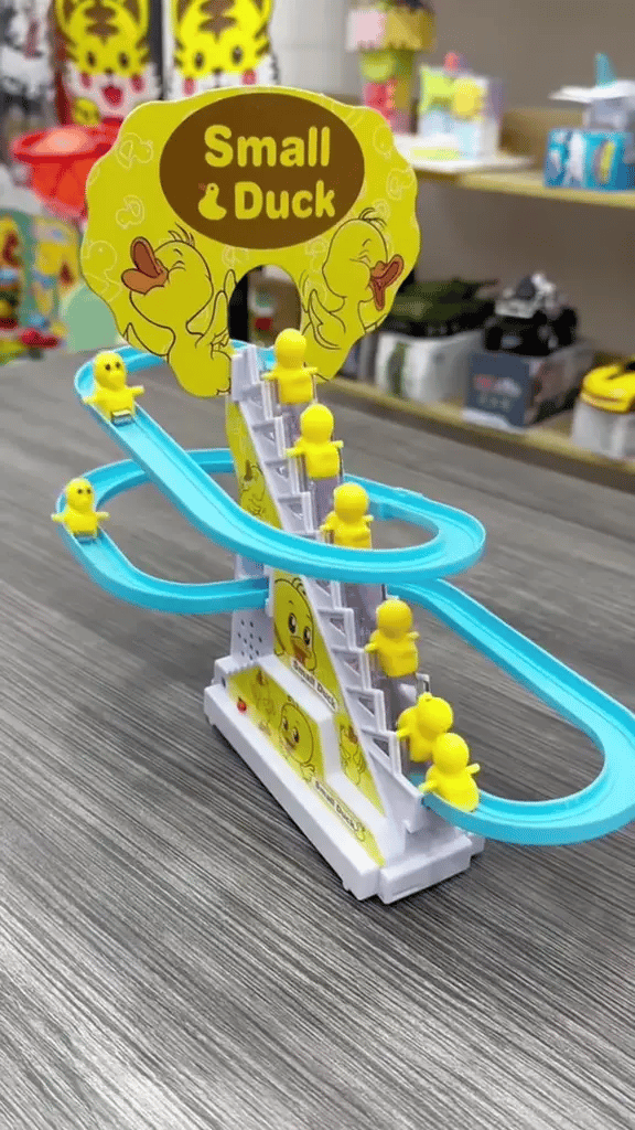 Ovaj interaktivni tobogan dizajniran je tako da mini patkice same kruže po spiralnoj stazi – penju se pomoću pokretne trake, a zatim klize nazad niz tobogan, stvarajući neprekidnu zabavu. Ugrađena melodija i svetlosni efekti dodatno oživljavaju igru i privlače pažnju mališana.